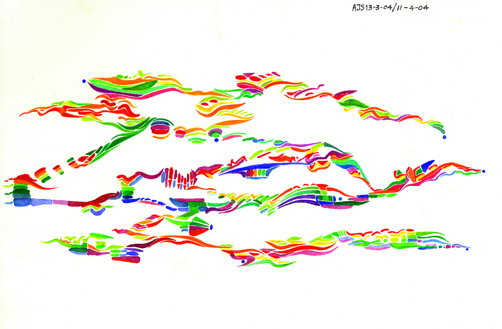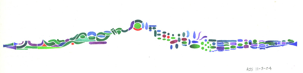 One solution was to make work which was large enough and of a sufficient length that the viewer had to spend time in reading it from beginning to end; this also solved the problem of tempo. The difficulty with this linear approach is that visual art does not have an end point but moves back and forth, this was solved by making both ends 'return' into the composition. This is done by creating strong harmonic relationships which force the viewer to read back into the composition. The viewer then is forced to view the harmonic relationships like 'events' within the whole. This concept is close to the way some composers would think and is not unusual among 'Sonic Artists', which is more the tradition I percieve my own soundwork as being part of. |